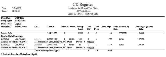 This report is similar to the Dosing History and Total Dispensed by Day reports, but is formatted specifically for facilities operating in the UK to meet specific requirements. This report displays all dosing transactions recorded over a selected date range, as well as inventory shipments added on the Add Bulk Inventory screen. This report displays much of the same information as other dispensing records, but also includes each patient's full address and prescribing doctor's prescriber number. The 'Running Total' column tracks a running total of remaining bulk inventory in the bottle being dispensed from. This report is generally printed at the end of each dispensing date, and serves as the formal hard copy record of dispensing activity once signed by dispensing personnel.